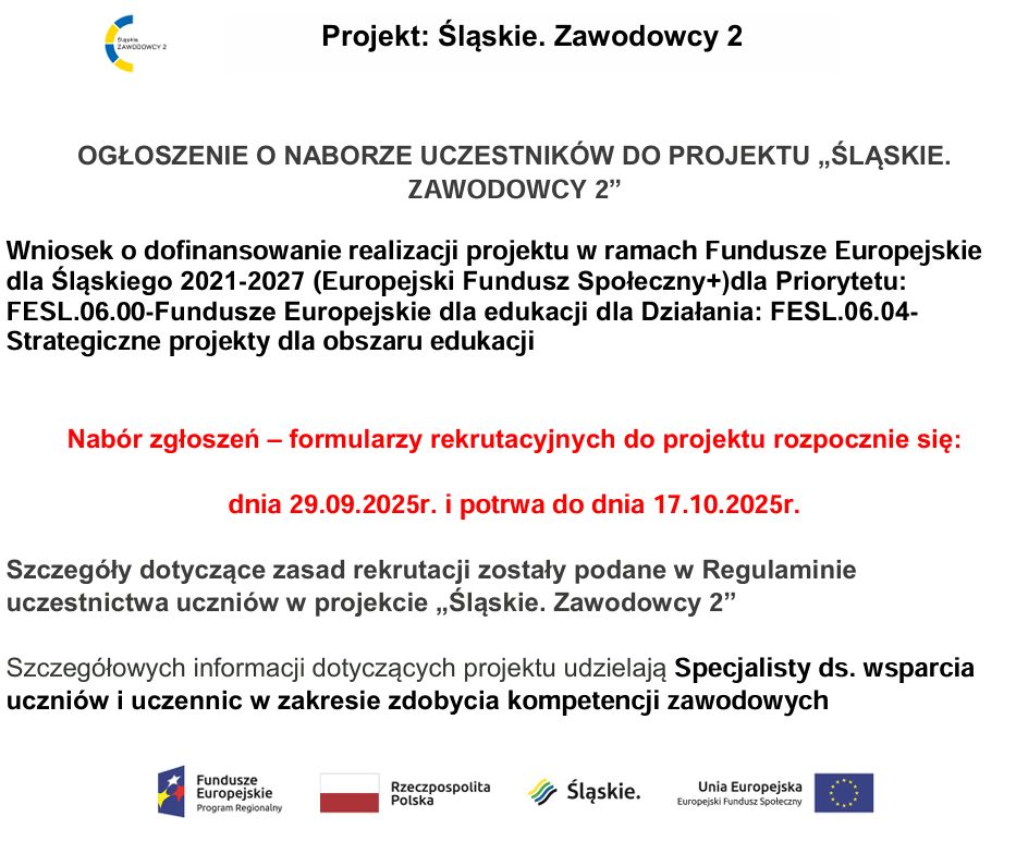 Projekt Śląskie. Zawodowcy 2 realizowany jest w okresie od 1 stycznia 2024 r. do 31 grudnia 2029 r.